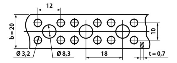 Оцинкованная стальная полоса толщиной 0,7 мм с равномерно пробитыми отверстиями по всей длине. Поставляется в бухтах, легко режется ножницами по металлу и гнётся руками.