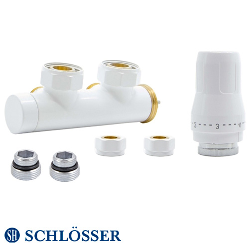 Описание продукта: Комплект термостатический Schlösser Duo-Plex 3/4x15мм Cu, угловой правый, +2 шт. нипель, белый (HB02KPC-R9016)