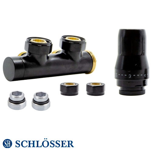 Описание продукта: Комплект термостатический Schlösser Duo-Plex 3/4x15мм Cu, угловой правый, +2 шт. нипель, черный матовый (HB02KPC-R90051)