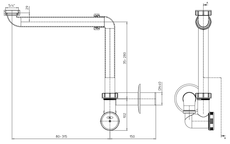 Сифон экономящий пространство под мойкой, с поворотным шарниром, с прочисткой-грязесборника, с резьбовым подсоединением 5/4", с горизонтальным выпуском DN40 и с декоративной розеткой.