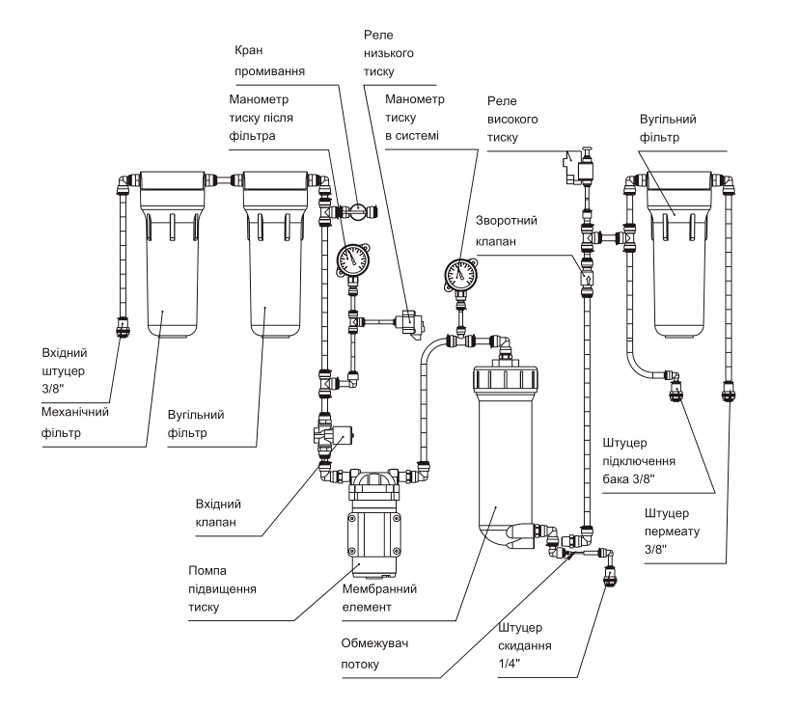- Зручність обслуговування - кран промивання картриджів, манометри на передній панелі, яскраве підсвічування, трійник для підключення.