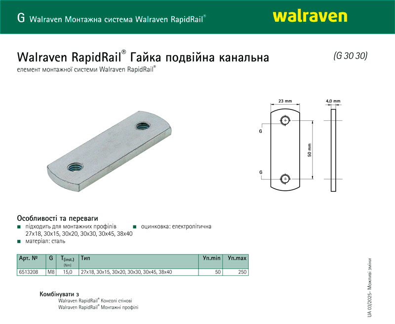 Характеристики товара: Гайка канальна подвійна Walraven BIS RapidRail® М8 (6513208)