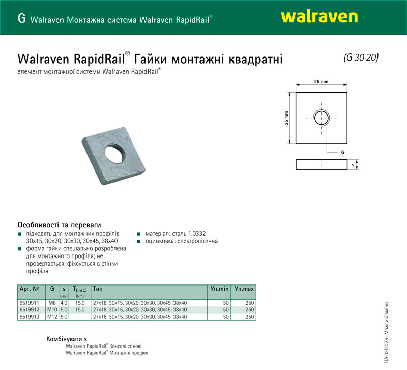 Характеристики товара: Гайка квадратна Walraven BIS RapidRail® М10 (6519912)