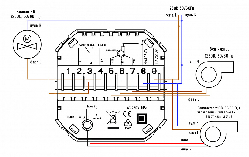 - Контролює вентилятор на 230В або 0-10В.