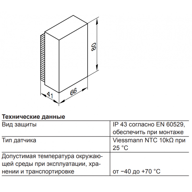 Корпус датчика виконаний із міцного матеріалу, стійкого до дії опадів, сонця та перепадів температур, що гарантує тривалий термін служби при зовнішньому монтажі. Модель легко інтегрується з котлами та контролерами Viessmann, що забезпечує точну та надійну роботу системи.