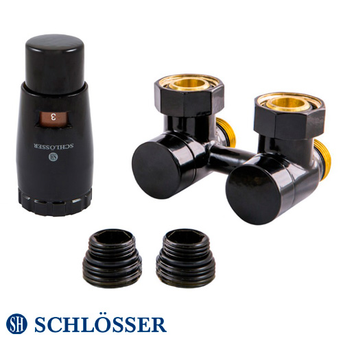 Опис продукту Комплект ексклюзивних вузлів Schlösser GZ 3/4 x M 22х1, 5, кутовий, +2 шт. ніпель, термоголовка MINI M30x1.5 (601000044.RAL90051)