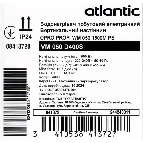 Опис продукту Бойлер електричний Atlantic O'Pro Profi VM 050 D400S (841372)