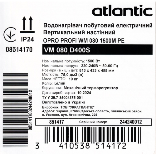 Опис продукту Бойлер електричний Atlantic O'Pro Profi VM 080 D400S (851417)