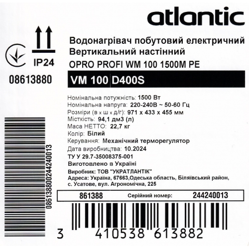 Опис продукту Бойлер електричний Atlantic O'Pro Profi VM 100 D400S (861388)