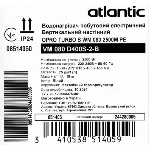 Характеристики товара: Бойлер електричний Atlantic Opro Turbo VM 080 D400S-2-B (851405)