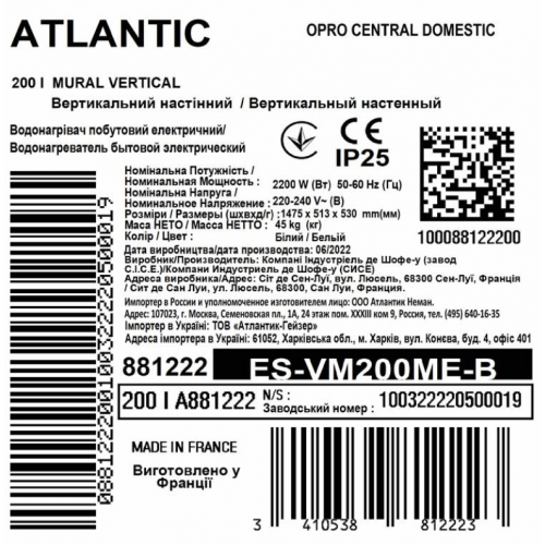Описание продукта: Бойлер электрический Atlantic Opro Central Domestic Wall Mounted 200 ES-VM200ME-B (881222)
